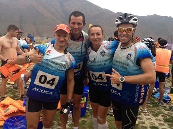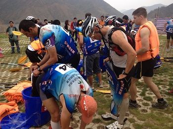 Day 2 went good. We finished 5th after Team Thule (France, NZ, Sweden), FJS (Sweden) and MoxieGear /Nuun Australia and Red Bull China. But then Red Bull was penalised by 6 minutes for leaving rest area earlier than they had to, so in final list of results we supposed to be 4th. Team worked very well. Everyone stayed strong, tough without big ups and downs. First, we had a 1.5 hour terrible bus trip to the start (during this kind of trips me (Maria) usually think, that I would rather ride my bike here). Start was at around 8.40 am with 10 km paddle on the lake that turned to be 7, unfortunately for us as we were in the first bunch of boats (well, it is better say it was train of 6 boats sitting one after another the whole way) and did really good. So we left transition area on respectable 2nd position behind other Aussie team Moxie Gear /Nuun. After the paddle we headed off to 30km mountain bike leg and were pretty quickly passed by Sweds and Thule.